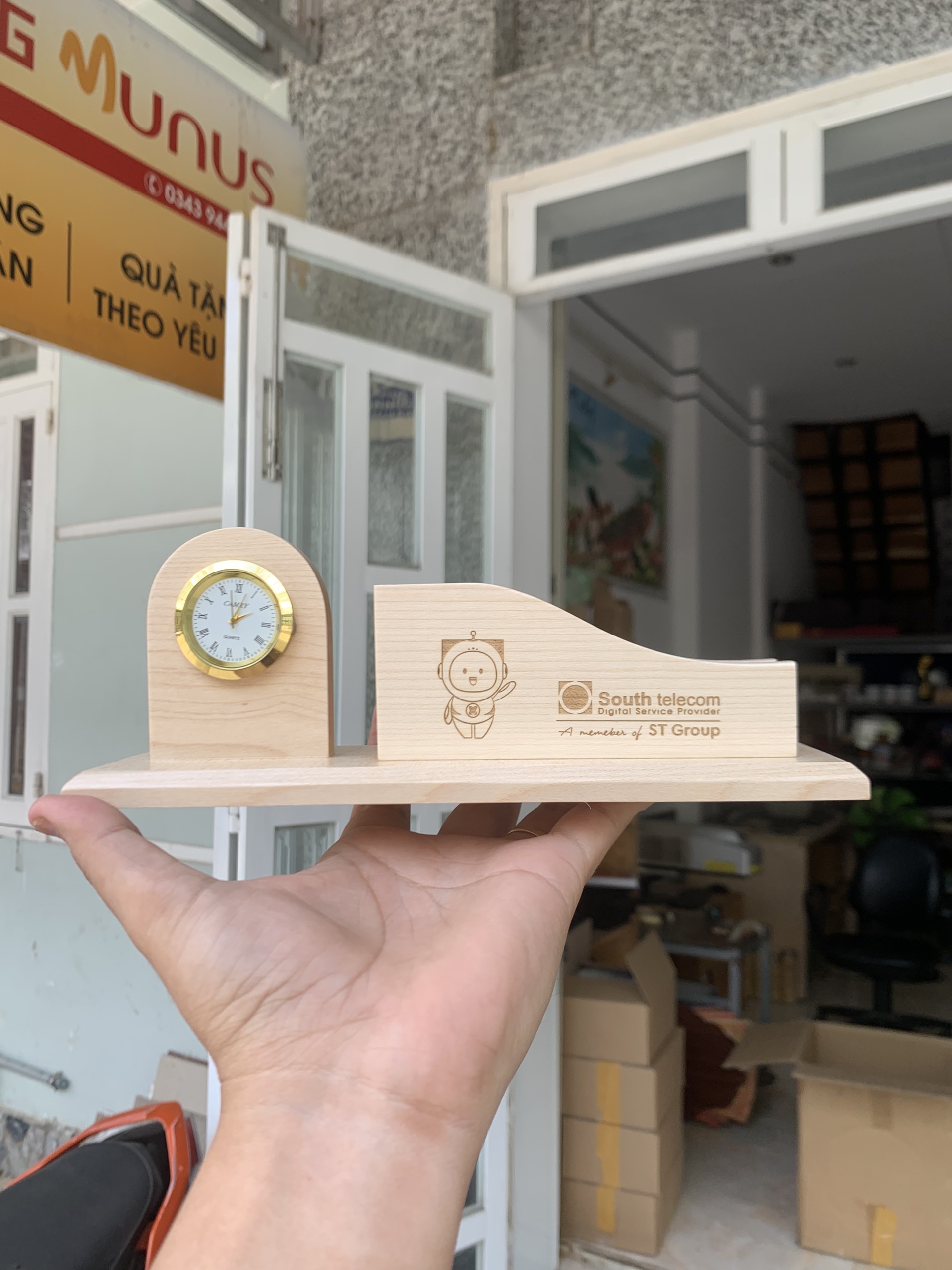 Đồng hồ chạy bằng pin nên bạn có thể điều chỉnh giờ chính xác và thay pin dễ dàng. Giá cả của mẫu này cao hơn loại hộp thông thường. Ngoài ra, Munus cũng nhận điêu khắc theo yêu cầu đối với sản phẩm này. Công nghệ khắc laser hiện đại giúp logo công ty, đơn vị nổi bật trên nền gỗ một cách tinh tế.