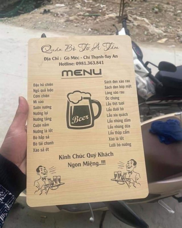 Menu gỗ đó là những cuốn menu, thực đơn món của nhà hàng cũng như là menu cafe được làm bằng chất liệu gỗ tự nhiên hoặc là gỗ ép. Chúng sẽ có đa dạng hình dáng khác nhau, cụ thể như thực đơn cầm tay và menu để bàn hoặc menu cuộn,vv. Bìa menu thường được khắc laser, tất cả các nội dung của menu sẽ được khắc laser hoặc có thể là in trên giấy C300. Nó sẽ phụ thuộc theo định dạng menu gỗ mà bạn đang làm.